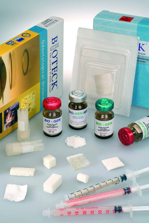 Los sustitutos óseos Bioteck se obtienen de tejido óseo equino mediante un exclusivo proceso químico y físico de desantigenización enzimática. El uso de enzimas digestivas que operan a temperatura fisiológica (37°C) permite eliminar completamente el componente antigénico del tejido, sin que sufra modificaciones el componente mineral y el colágeno óseo sobre el que se deposita. La fase mineral del hueso, no modificada, es reconocida como endógena por los osteoclastos. Por consiguiente, el sustituto óseo sufre un proceso de remodelación total, llegando a ser sustituido completamente por hueso endógeno, en tiempos fisiológicos. El componente colagénico, íntegro y no modificado, confiere al injerto (se trate de un bloque o cuña) la resistencia a la carga característica del hueso natural. Asimismo, en su conformación nativa, el colágeno óseo ejerce todos los efectos que se le atribuyen (entre ellos la función de coactivador de los factores de crecimiento endógenos y de sustrato para la adhesión celular de los osteoblastos), creando así un entorno fisiológico y biológicamente favorable a la regeneración ósea.